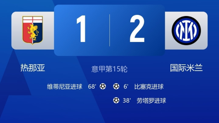 25/26赛季意甲联赛第15轮,国际米兰2-1战胜热那亚。开场仅6分钟,比塞克便破门,帮助国米取得领先。半场结束前,劳塔罗破门,将比分扩大为2-0。易边再战,维蒂尼亚第68分钟破门,帮助热那亚扳回一球。余下的比赛中,两队均未能再改写比分,最终国米客场2-1击败热那亚。国米取得联赛3连胜+积33分以1分优势升至积分榜首位。