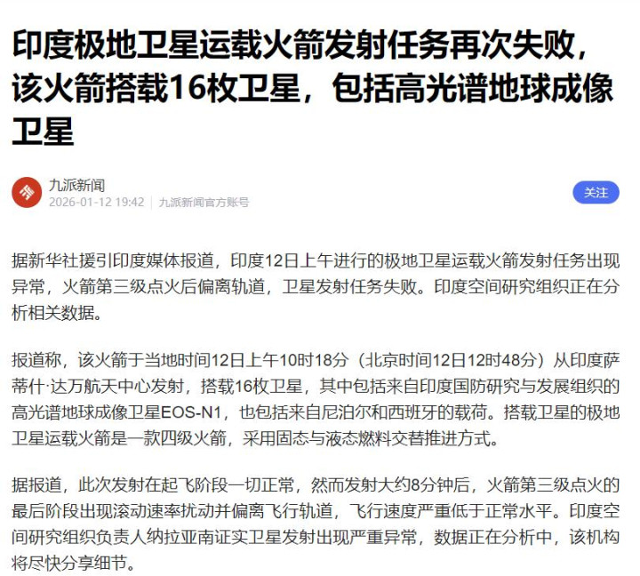 印度空间研究组织(ISRO)在2026年1月12日公布了这起失败,具体来说,是PSLV-C62型极地卫星运载火箭发射后轨道严重偏差,未能进入任务轨道,彻底变轨。