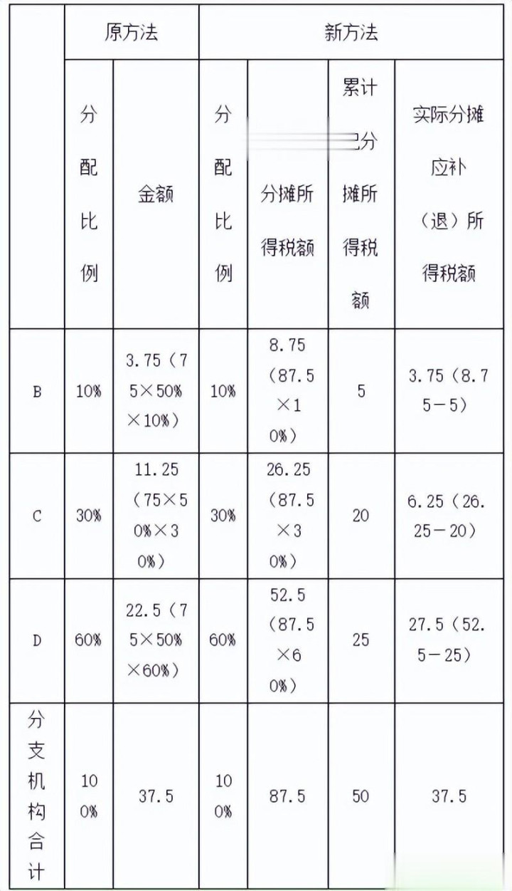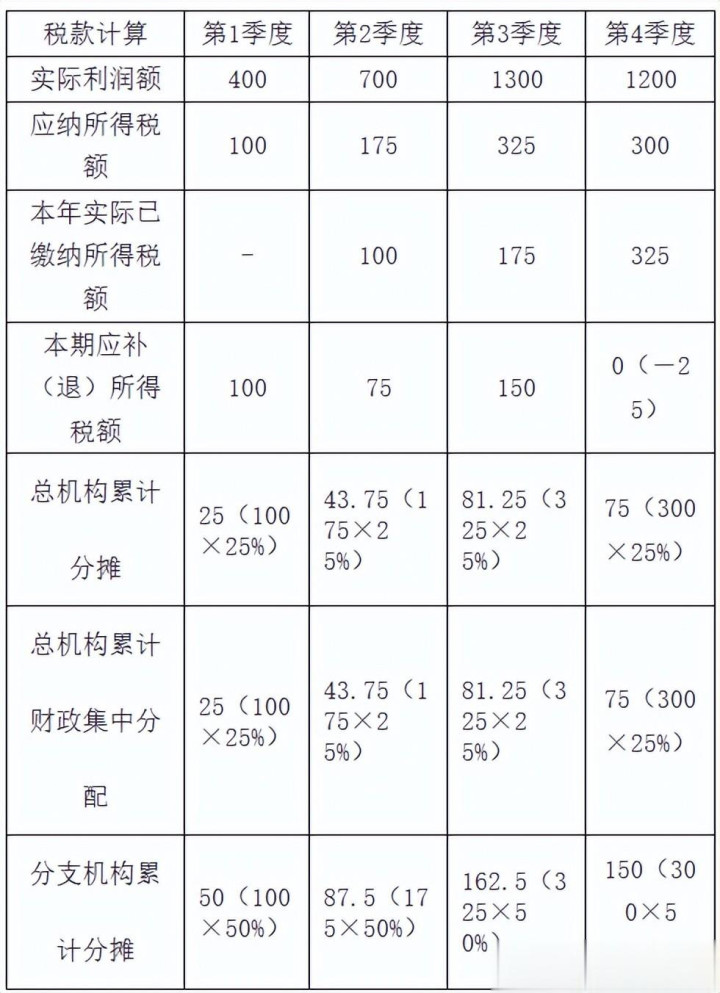 一是调整总分机构税款分摊计算方法。将汇缴环节总分机构分摊税款计算方法推广至预缴环节,即企业先对截止到本月(季)度应纳所得税额进行分摊,再由总、分机构分别抵减其已分摊预缴税款,并计算本月(季)度应补(退)所得税。举例说明如下: