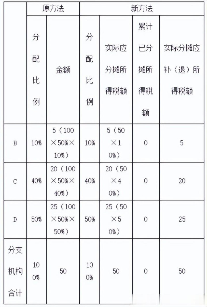 需要说明的是,汇总纳税企业如果不存在注销分支机构、分摊税款计算不准确等情形,无论按原计算方法,还是按新计算方法,结果都是一样的。但是,若汇总纳税企业前期预缴环节未准确计算分摊税款或当季发生分支机构注销情形,新计算方法将通过全量分摊方式,对全年分摊税款重新计算。案例中,由于第二季度发现第一季度C、D分支机构分配比例计算错误,在第二季度申报时按照新方法计算的C分支机构应补税额比原方法少5万元;D分支机构应补税额比原方法多5万元;B分支机构分配比例没有错误,两种方法计算结果一致。D分支机构注销后,需重新计算分配比例,在第三季度申报时按照新方法计算的B分支机构应补税额比原方法少1.75万元,C分支机构应补税额比原方法多1.75万元。